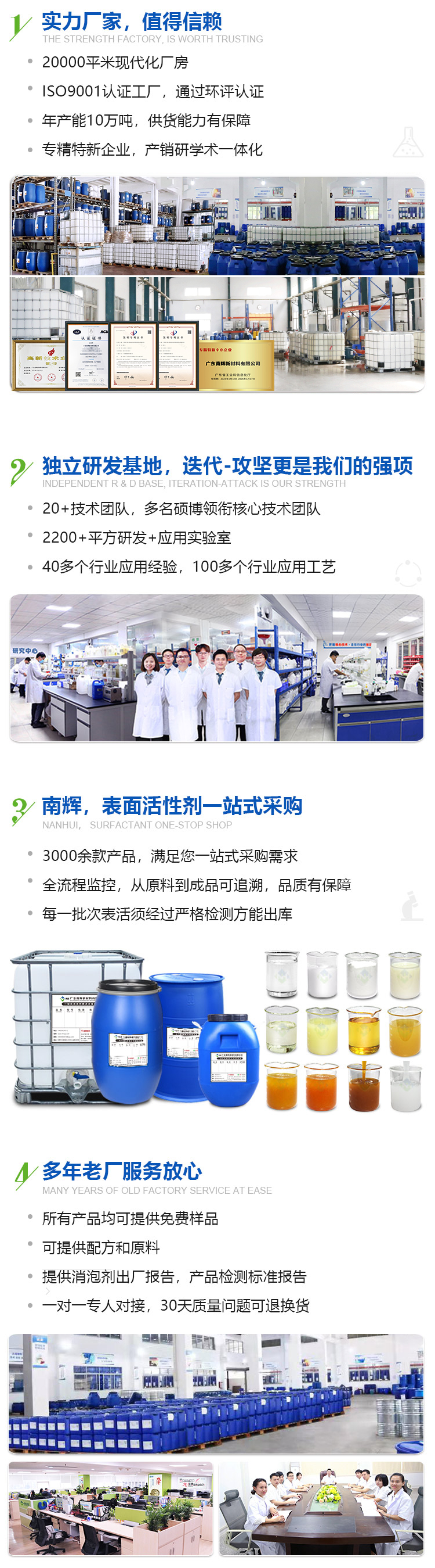 廣東南輝新材料有限公司,是一家致力于表面活性劑研發(fā)、生產(chǎn)、銷(xiāo)售為一體的國(guó)家高新技術(shù)企業(yè),擁有獨(dú)立的研發(fā)基地,主要研發(fā)產(chǎn)品有:乳化劑、滲透劑、勻染劑、司盤(pán)、吐溫、消泡劑等3000余款產(chǎn)品。南輝擁有20000平方米的現(xiàn)代化生產(chǎn)車(chē)間,年產(chǎn)能可達(dá)10萬(wàn)噸。通過(guò)ISO9001:2015質(zhì)量管理體系認(rèn)證,已獲得十余項(xiàng)不同產(chǎn)品的發(fā)明專(zhuān)利授權(quán),被評(píng)為廣東省"專(zhuān)精特新"企業(yè)。從2018年開(kāi)始批量出口至俄羅斯、日本、馬來(lái)西亞、印度、秘魯?shù)葒?guó)家,已成為國(guó)內(nèi)目前主要的表面活性劑生產(chǎn)廠家。